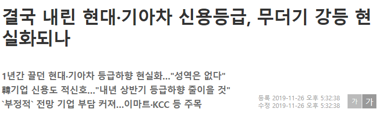 내용1 : 무디스에서 11월에 한국 신용등급 강등하려고 했는데 그것을 겨우겨우 입막음했다. 그러나 내년 1월에 신용평가사들이 무더기로 한국기업 및 한국 신용등급 내릴예정이다. 특히 조심해야 할 기업으로는 대기업 I사와 D사가 있다.