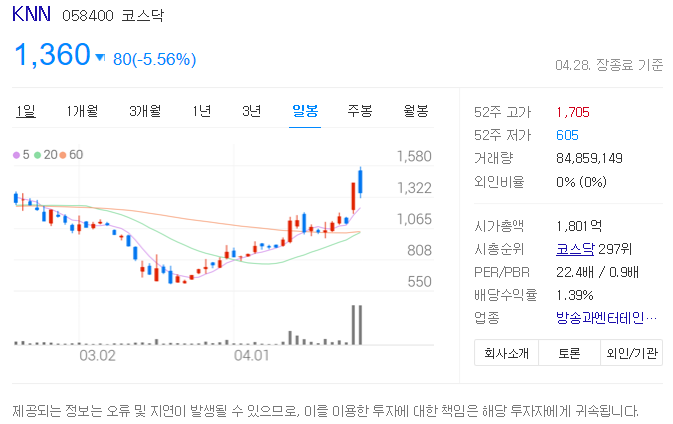 KNN은 홍정욱 정 의원의 누나인 홍정아씨가 대표를 맡고 잇는 부산글로벌 빌리지의 지분을 50%이상 보유한 대표적인 홍정욱 테마주이며 대장주 흐름을 보이고 있습니다.