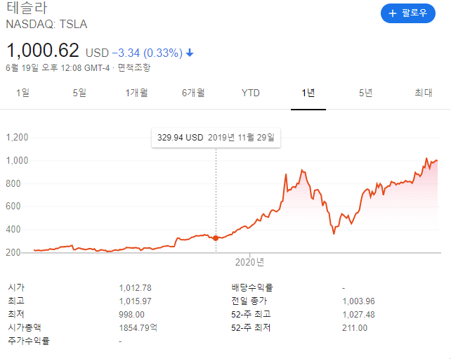 테슬라의 주가도 하늘 높은 줄 모르고 오르고 있다.