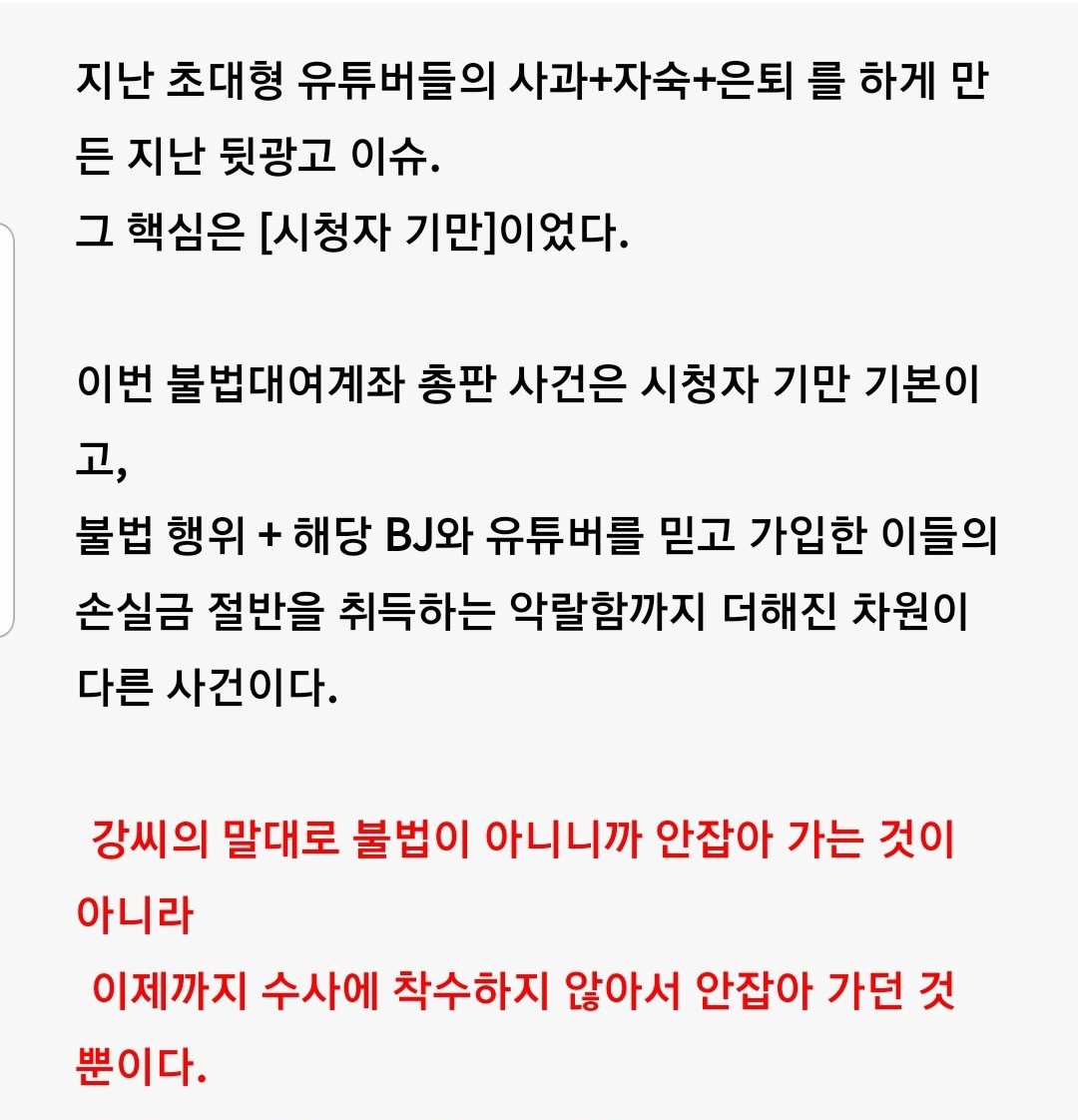 과거 아프리카TV의 해외선물 BJ 강은호가 불법선물대여계좌 의혹에 휩싸였습니다. 유튜버 기자왕 김기자 채널에서 이 내용을 다루고 있는데요. 최근에 이에대한 내용을 찾아보려면 삭제가 되어있습니다. 삭제된 글의 캡쳐본을 일부 공개드립니다.