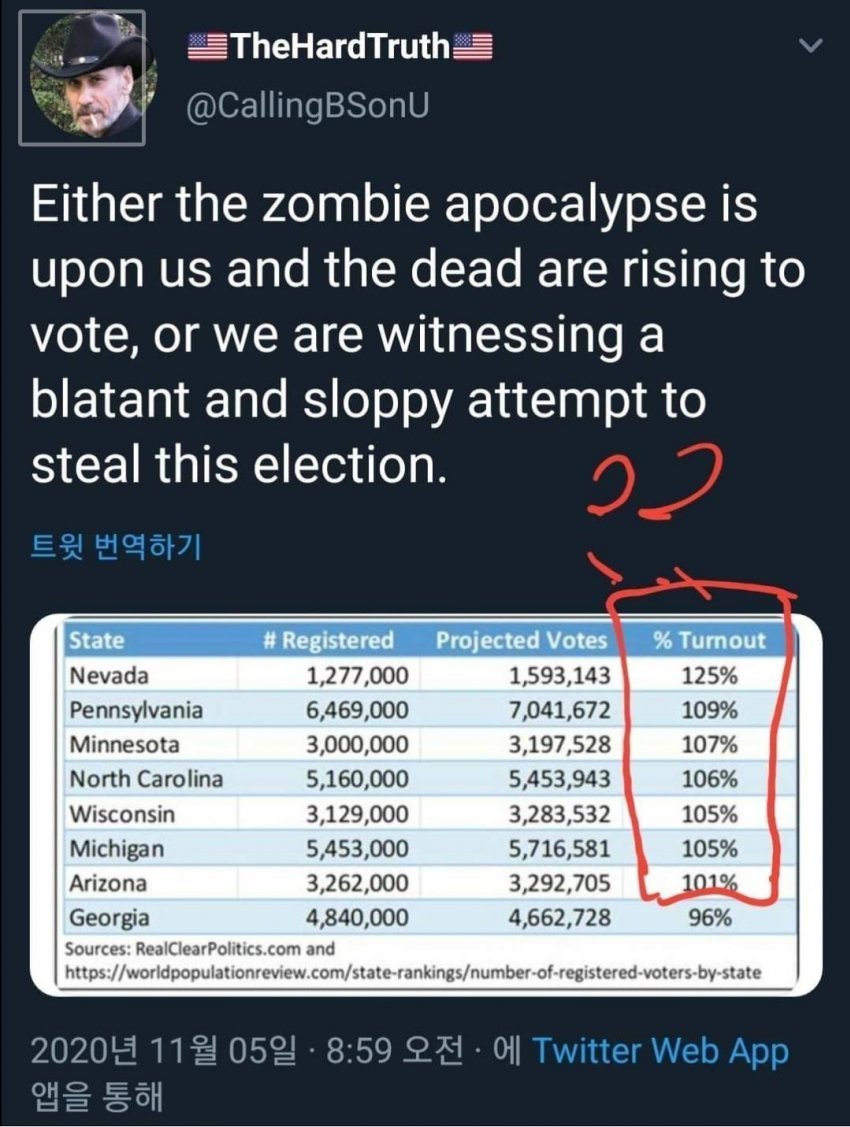 개표 초반만 하더라도 트럼프의 압승이 예상되었는데 사전투표인 우편투표를 개표하자마자 말도안되는 비율로 조바이든 후보의 표가 나왔다.