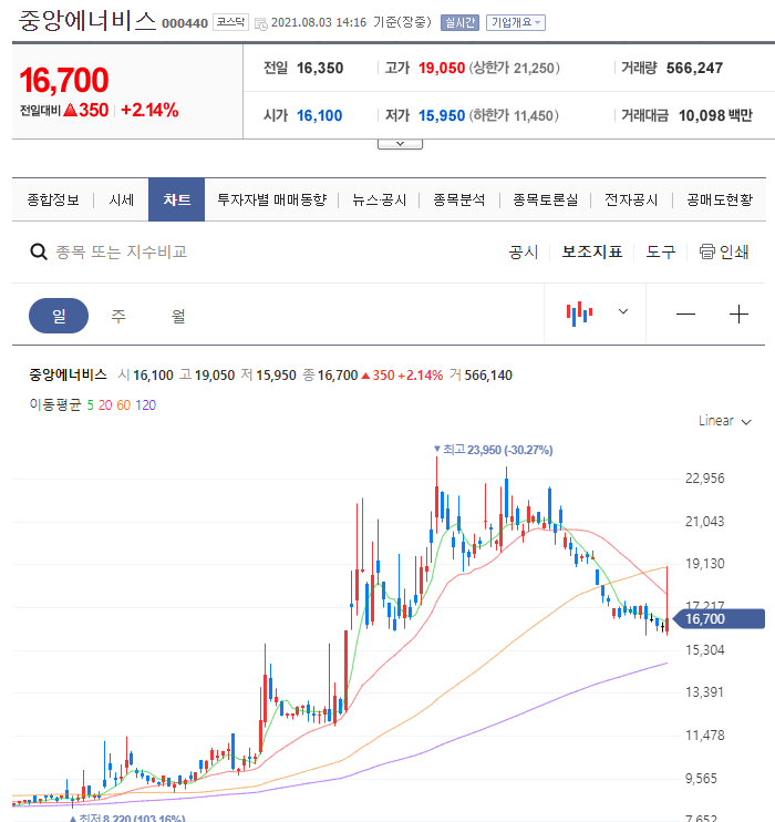 - 중앙에너비스는 고가 19050원을 기록 +16.51%