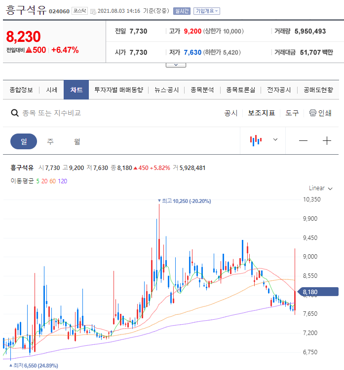 - 흥구석유주가는 고가 9200원을 기록 +19.02%
